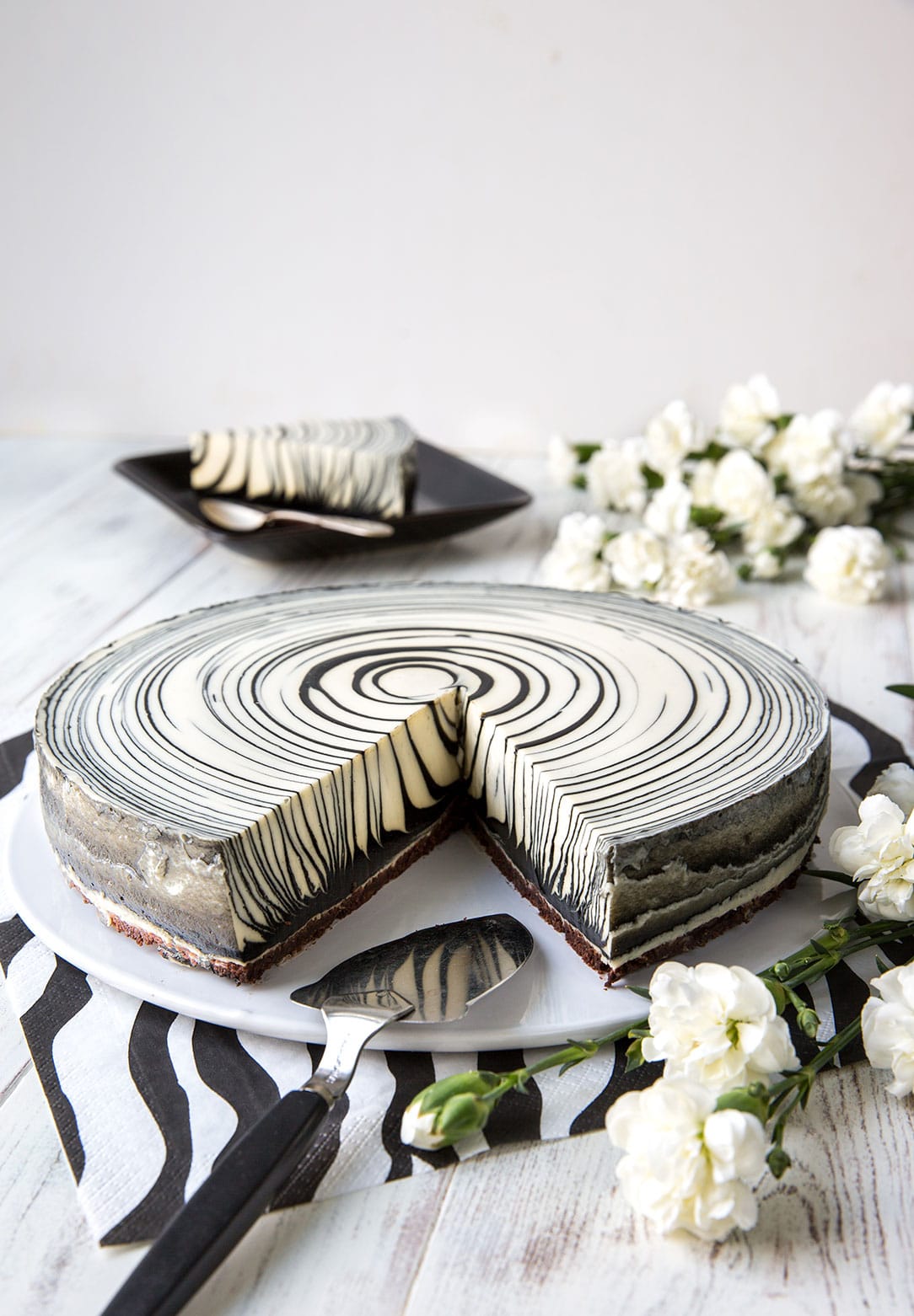 - Kumoa kakku tarjoilulautaselle ja poista kelmu. Tarjoilulautasena kannattaa käyttää jalallista mallia, jolloin saat tehtyä hämähäkille pidemmät jalat.