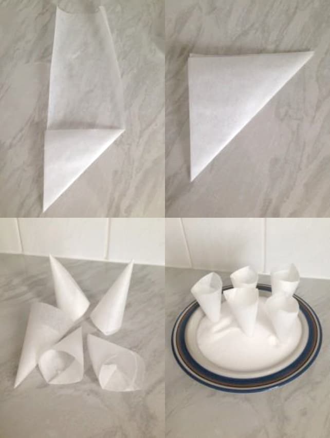 Myös nekkujen tötteröt on hyvä tehdä valmiiksi. Aloita leikkaamalla leivinpaperista ensimmäisen kuvan mukaisia suikaleita (omani ovat n. 15 cm leveitä). Taita oikeasta alakulmasta kolmionmuotoinen osa vasempaan reunaan. Leikkaa sitten toisen kuvan tapaan yläosasta ylimääräinen paperi pois (palasta saa tehtyä kyllä vielä toisen nekkutötterön). Puolita vielä syntynyt neliö kahdeksi kolmioksi. Aseta kolmion kärki sitten itseäsi vasten, nappaa keski- ja etusormen väliin paperin vasen reuna ja pyöräytä kolmion oikeasta reunasta vasemmalle päin sormiesi ympärille. Kiristä nyt muodostunutta putkiloa peukaloiden kanssa teräväksi tötteröksi. Taita kolmannen kuvan tapaan ylimenevä leivinpaperi tötterön sisälle ja vedä kynsillä taitosta kunnolla. Nyt sinulla on valmiita tötteröitä nekkuja varten! Tötteröt on helppo täyttää ja laittaa jääkaappiin jähmettymään, kun laitat ne sokerilla täytettyyn astiaan pystyyn.