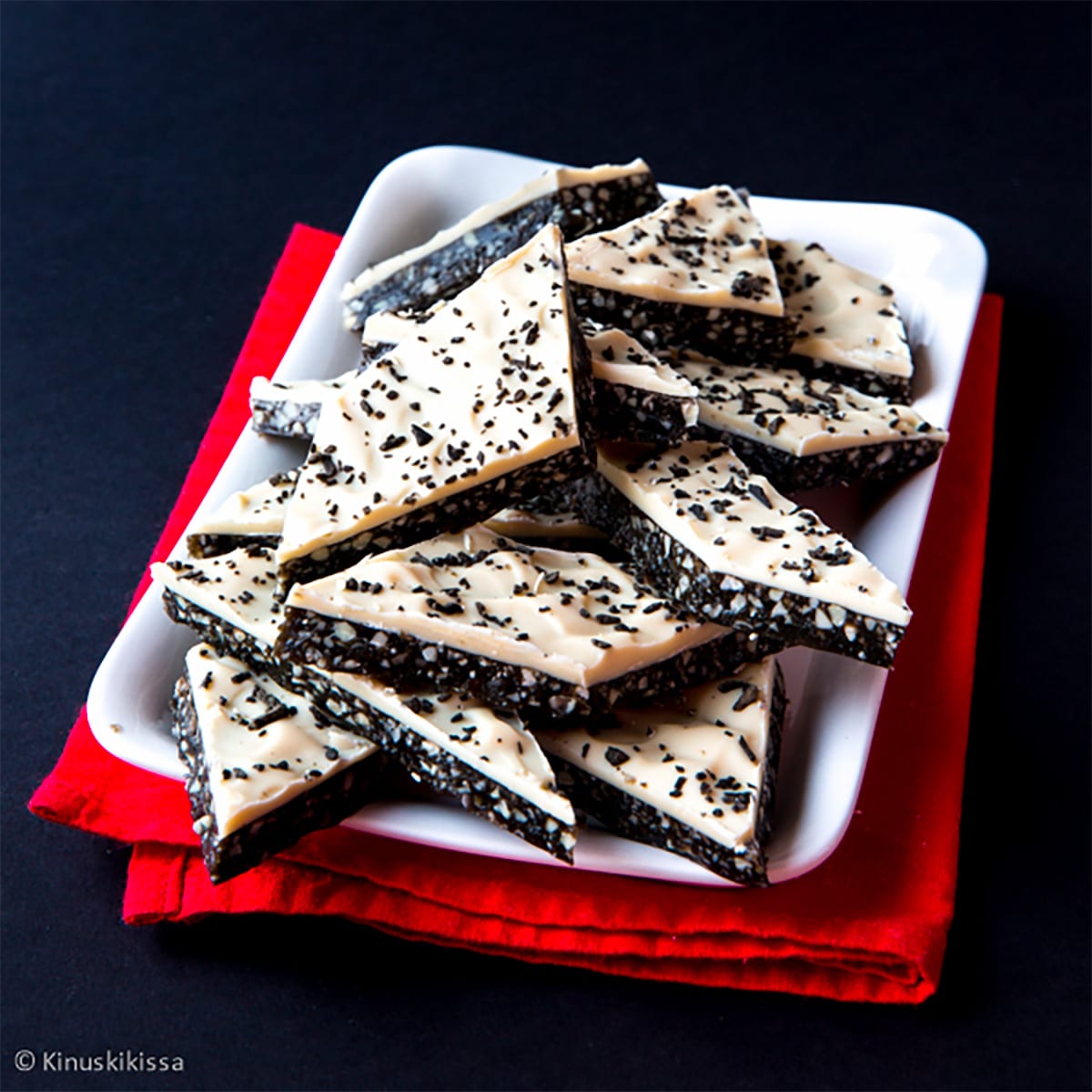 - Irrota kakku vuoasta ja siirrä tarjoilulautaselle. Koristele halutessasi salmiakkikarkeilla.