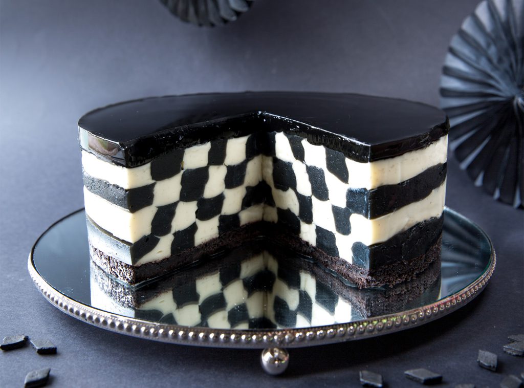 - Pursota nokare toista täytettä vuoan keskelle ja sen ympärille vuorotellen mustia ja valkoisia renkaita. Tee pursotuksesta suunnilleen yhtä korkeaa kuin se on leveää. Näin ollen toinen ohuempi kerros päälle saattaa olla tarpeen. Tasoita pinta kuvioita mukaillen kevyesti lusikalla. Pursota päälle seuraava kerros siten, että valkoisen päälle tulee mustaa ja toisinpäin. Täytteet riittävät tässä vuoassa ja näillä mitoilla neljään kerrokseen.