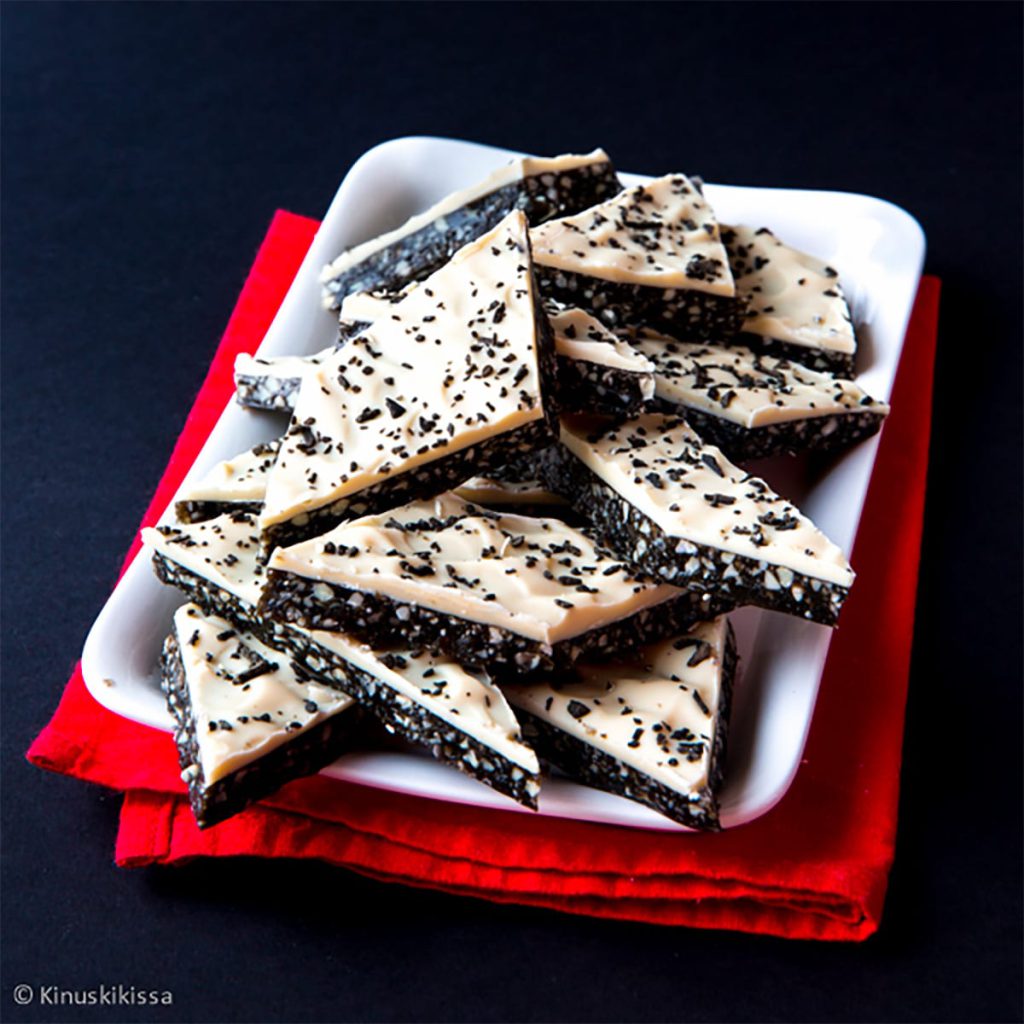 - Paloittele valkosuklaa lautaselle ja sulata mikrossa miedolla lämmöllä (max 250 W) tai kuumassa vesihauteessa. Levitä suklaasula salmiakkikrokantin päälle. Voit kuvioida pinnan lastan kärjellä – epätasainen pinta on sileää mielenkiintoisemman näköinen.